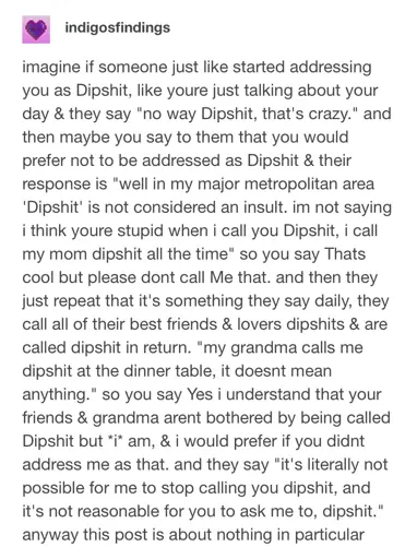 imagine if someone just like started addressing you as Dipshit, like youre just talking about your day & they say “no way Dipshit, that’s crazy.” and then maybe you say to them that you would prefer not to be addressed as Dipshit & their response is “well in my major metropolitan area ‘Dipshit’ is not considered an insult. im not saying i think youre stupid when i call you Dipshit, i call my mom dipshit all the time” so you say Thats cool but please dont call Me that. and then they just repeat that it’s something they say daily, they call all of their best friends & lovers dipshits & are called dipshit in return. “my grandma calls me dipshit at the dinner table, it doesnt mean anything.” so you say Yes i understand that your friends & grandma arent bothered by being called Dipshit but i am, & i would prefer if you didnt address me as that. and they say “it’s literally not possible for me to stop calling you dipshit, and it’s not reasonable for you to ask me to, dipshit.” anyway this post is about nothing in particular