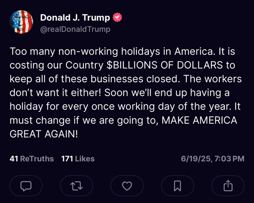 He actually said this 😲 https://www.cbsnews.com/news/juneteenth-trump-too-many-non-working-holidays/ https://edition.cnn.com/2025/06/20/economy/trump-too-many-holidays-economy