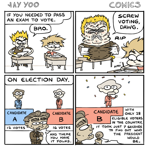 arrow-up1541arrow-down1imageIf You Needed to Pass an Exam to Votelemmy.worldBlujayooo@lemmy.world to Comic Strips@lemmy.worldEnglish · 2 months agomessage-square270linkfedilink