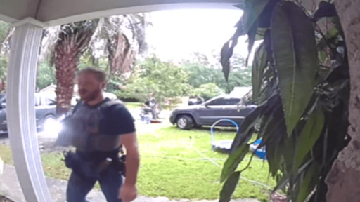 Ring footage shows an agent pulling his gun on her, after which he shoves her down multiple times, pushes her back into house & slams the door.