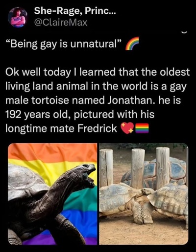This is the sort of argument that might stick though “oh yea well world’s oldest tortoise is a 150 gay monogomous male tortoise named Jonathan”.