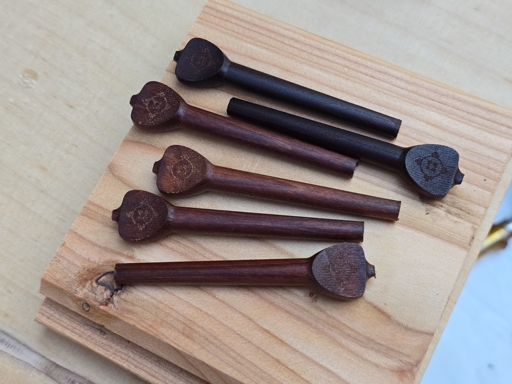 Tuning pegs for musical instruments are commonly made from ebony or boxwood, but in medieval times and renaissance they would also be made from roasted maple. Maple is a relatively soft wood, so the trick is to roast it, which makes it very light and porous, and then let it soak in a mixture of linseed oil and turpentine overnight. It soaks the oil in like a sponge, going from swimming on the surface to sinking to the ground when it’s saturated. The oil hardens and reinforces the wood, kind of like epoxy stabilised wood.