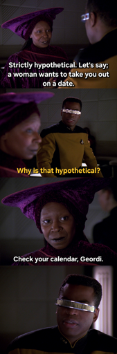 minus-squareSanctimoniousApelinkfedilinkarrow-up10·13 days agoOof! Was she checking up on his holodeck usage?