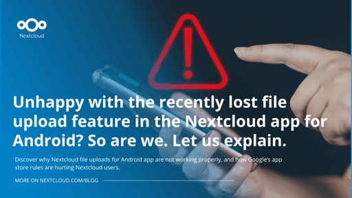 tfm@europe.pubM to Technology@europe.pubEnglish · 5 months agoUnhappy with the recently lost file upload feature in the Nextcloud app for Android? So are we. Let us explain. - Nextcloudnextcloud.comexternal-linkmessage-square0linkfedilinkarrow-up16arrow-down10file-textcross-posted to: buyeuropean@feddit.uknextcloud@lemmy.worldnextcloud@lemmy.mltechnology@lemmy.worldhackernews@lemmy.bestiver.se