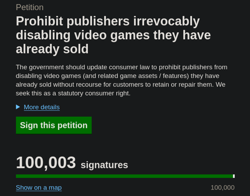 A: No, the market demand and profitability of these games means the video games industry has an ongoing interest in selling these. Since our proposals do not interfere with existing business models, these types of games can remain just as profitable, ensuring their survival. The only difference is future ones will need to be designed with an “end of life” build once support finally ends. This is not difficult to have if done from the design phase onward, and any costs to it are far outweighed by potential sales in Australia and / or the EU.