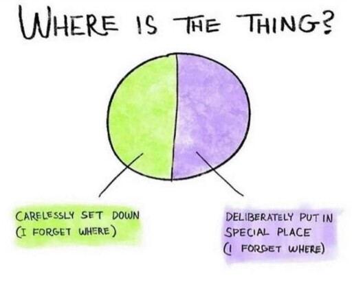 I don’t remember where things belong, but I know immediately that I would put vitamins in the cabinet, on the counter, on the table, or in a travel bag. There’s basically nowhere else I’d put them unless something very unusual happened, so then I’d look to see if they fell from one of these places