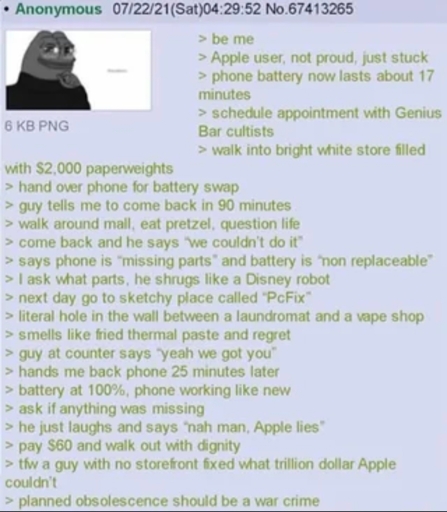 Zenoctate@lemmy.world to Greentext@sh.itjust.works · 3 months agoAnon describes apple's practiceslemmy.worldimagemessage-square85linkfedilinkarrow-up11.16Karrow-down115