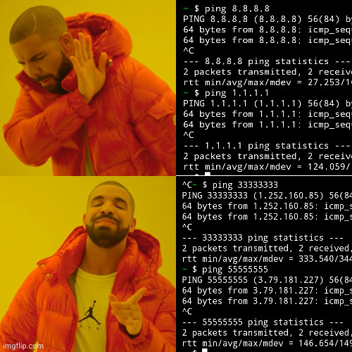 $ ping 16843009 PING 16843009 (1.1.1.1) 56(84) bytes of data. 64 bytes from 1.1.1.1: icmp_seq=1 ttl=53 time=4.06 ms 64 bytes from 1.1.1.1: icmp_seq=2 ttl=53 time=4.04 ms 64 bytes from 1.1.1.1: icmp_seq=3 ttl=53 time=4.05 ms ^C --- 16843009 ping statistics --- 3 packets transmitted, 3 received, 0% packet loss, time 2003ms rtt min/avg/max/mdev = 4.044/4.053/4.062/0.007 ms