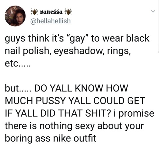 Didn’t have to put on make up and jewelry. Just have long hair and you could be fat or skinny, pretty or ugly. Didn’t fucking matter. I’d look. If Henry Cavill walked down the street next to a nerdy guy with long hair, I would look at the nerd everytime. If he wore band t-shirts and military boots, it was game over. Only way a guy could fuck it up for himself with me was if he started the nice guy routine or was so socially awkward he couldn’t talk to a girl. I have experienced both. The latter was a full date where the guy didn’t say a word to me once and I was the one who had walked 20 km to get to his place because he had social anxiety and couldn’t leave his home. Poor guy. I hope he’s doing better today.