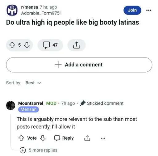 if anyone wants the link https://redlib.catsarch.com/r/mensa/comments/1ci8rdx/do_ultra_high_iq_people_like_big_booty_latinas/