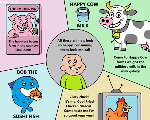 [a character smiles, in the center of all this] All these animals look so happy, consuming them feels ethical!