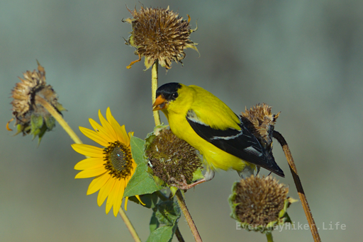 Saw this American Goldfinch having a breakfast snack at Makoshika State Park in Glendive MT. Taken 7/13/25. Originally had it marked as a tanager