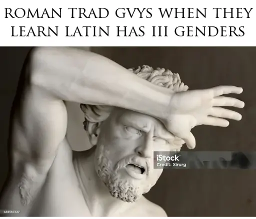 Explanation: Just a linguistics joke. “Trad” chuds often insist there are only two genders, and idolize Rome, without the first idea about Rome other than “Marble busts and strong jawed legions”.