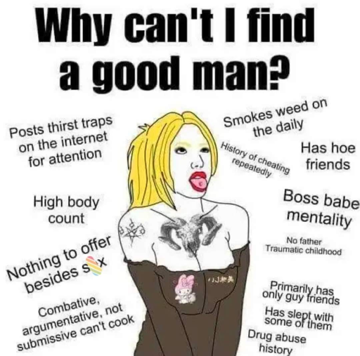 The attached meme seems to do a lot of slut shaming, but it is also broadly criticizing a type of person… For instance, “combative and argumentative,” “drug abuse,” “boss babe,” etc. are brought up.