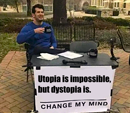 The U in Utopia is both the privative “u” and a form of the meliorative “eu”. The word was coined by Thomas More in 1516 to literally to mean “a place that is so perfect it cannot exist”, and the hope was that the fiction would serve as an unattainable model to aim for, to motivate and direct the progress of real-life society Though the word “dystopia” was later coined as an inverse mirror of utopia, it doesn’t use nor does it require a mirrored etymological wordplay: “dys” just means “bad”, basically, no implication of inexistence there. And for good reason: the dystopia is a trope that is used mainly in anticipatory fiction as a warning for where real-life society could be headed, as such it would make no sense for it to be depicted as impossible, on the contrary it must have a ring of truth to be an effective warning.