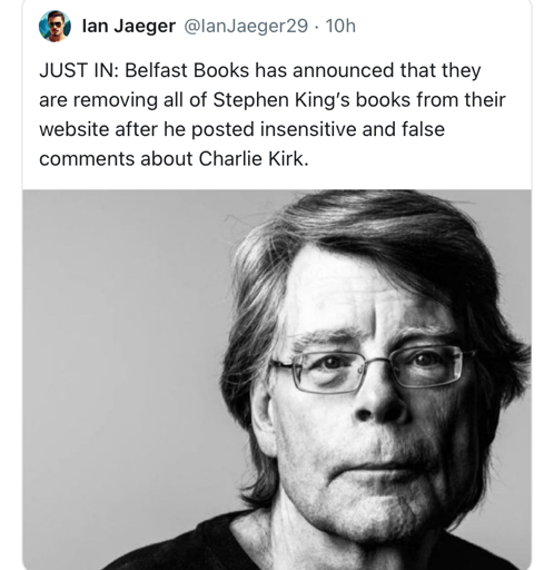 Any how Steve thought that was true, then people correct him a bit harshly. https://x.com/StephenKing/status/1966484038648021264 https://x.com/StephenKing/status/1966474125616013664 https://x.com/RubinReport/status/1966299918202540515