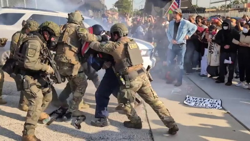 That whole crowd should have swarmed those 4 grabbing captain America… He did nothing except return the property that the ICE agents dropped on the sidewalk.