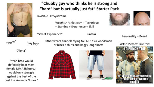 So while I really hate performative tough guy bullshit as a former MMA practitioner, I would really caution you against thinking the guy in the picture on the left is not really fucking strong. the guy who’s all cut up and striated with the ideal visible body often isn’t stronger than the dude with a couple layers of fat over his muscles that has been lifting his heavy body around his whole life. There’s also a class of dude I run into that just have some kind of genetics for absurd super colossal strength without any particular background in weightlifting or anything to justify why they are that strong (I’m sadly not in that cohort).