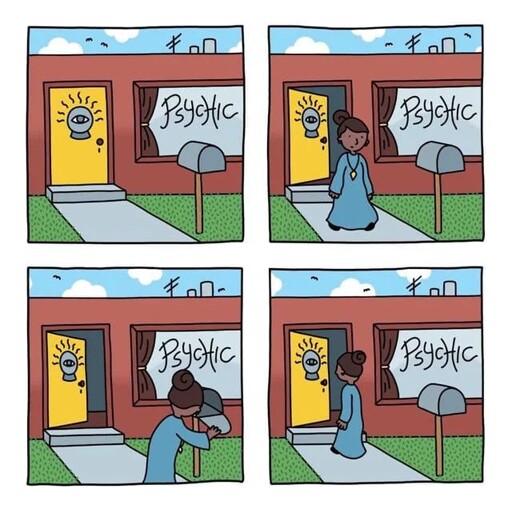 Garantee you it’s a psychic journey for her, going “I must be focused on getting a message for some reason”. Eventually someone will come into the shop and she’ll be convinced they bare a message for here. She’ll explain with lebgthy references to intricate coincidences, from Jungian theory, to numerology, to personal symbology.
