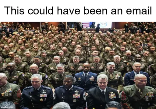 arrow-up1908arrow-down1imageHegseth's pointless meetinglemmy.worldrobocall@lemmy.world to Political Memes@lemmy.world · 10 days agomessage-square99linkfedilink