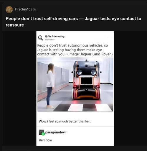 There is a real psychological effect to it. I think Mercedes was first to test it years ago. not with eyes but with a long LED light strip in the upper area of the front window. The goal was to communicate the “attention” of the vehicle to a pedestrian waiting to cross the street in a similar way that real drivers catch eye contact with pedestrians. This reassures the pedestrian that it is safe to cross the street - hey the guy sees me, I can safely go.