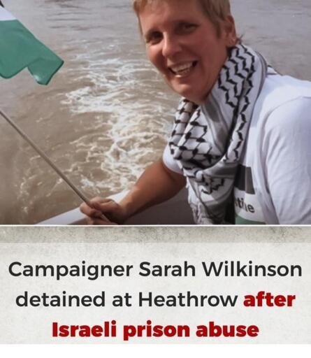 Veteran Palestine campaigner #sarahwilkinson who was reportedly subjected to severe mistreatment in an Israeli prison, has now been detained by UK police at Heathrow Airport for interrogation. as the UK moves inexerbobaly toward a more aunthortarian state