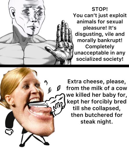 Can’t tell if this is criticism on non-vegans or if someone just really wants it to be socially acceptable to fuck a cow.