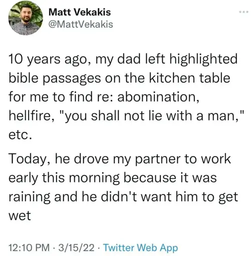 But I have many in my life that are loving, kind people who would give you the shirt off their back. Due to family influence, religion, or other factors, they have taken on some pretty repelling viewpoints on some issues. But they’re capable of change. Familiarization and a kind, guiding hand can go a long way.